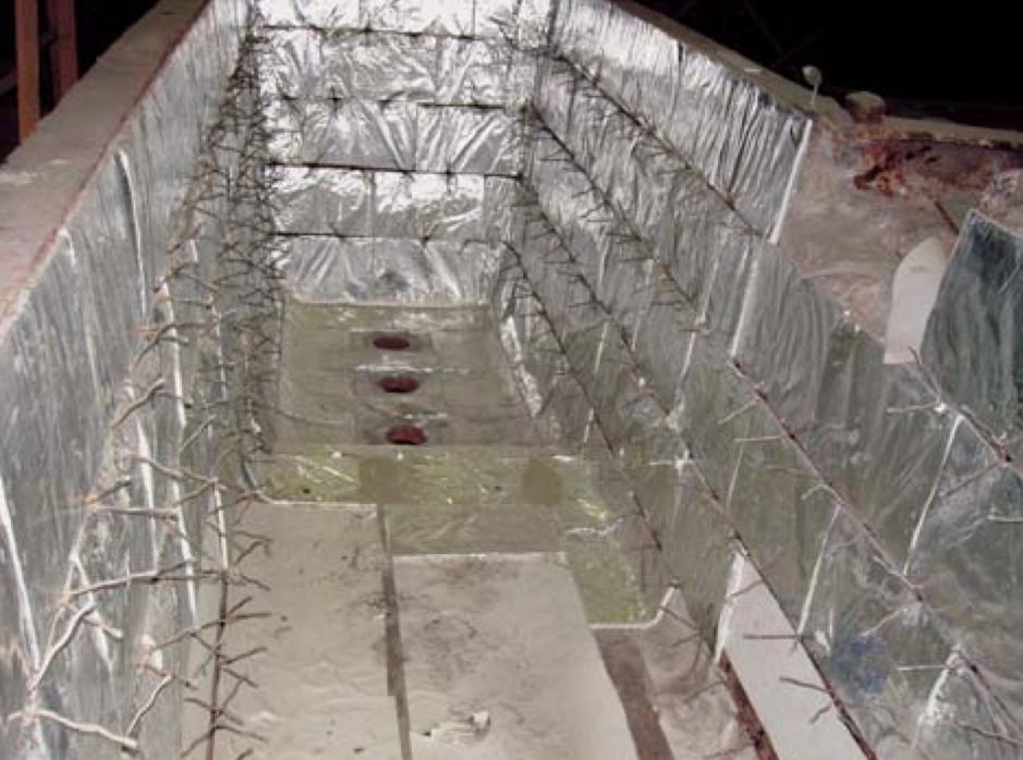 First, clean the inner walls of the ladle thoroughly. Apply a layer of adhesive to the ladle wall, then install the MIP-950S insulation layer. Afterward, construct the permanent and working layers in sequence.